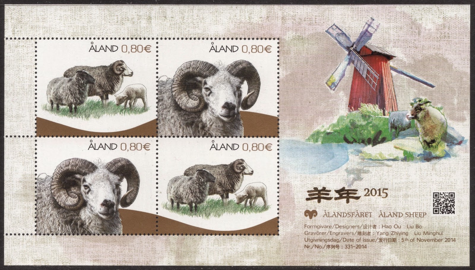 The result of that major effort is now available to us all in the shape of a lovely Aland miniature sheet. The two Chinese engravers who won the competition were Liu Minghui and Yang Zhiying. Liu engraved the stamp with single ram and Yang the stamp with the lamb on.