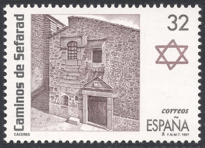 The two stamps included in the book were of course also easy to find.  First up we have a value from the 1997 'Jewish Quarters' set. De Oro engraved the façade of a 15th century building in St Anthony's Quarter in Cáceres.