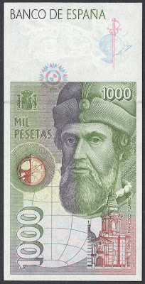 I had more luck with the 1990's banknote which includes a portrait by De Oro of Francisco Pizarro, the Spanish conquistador.